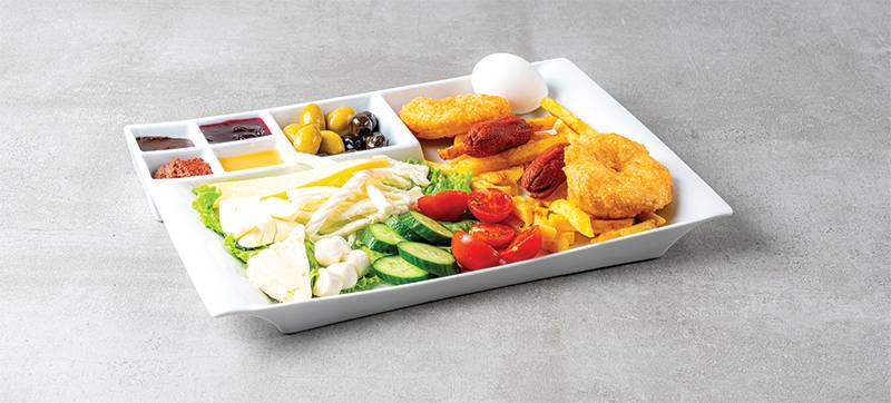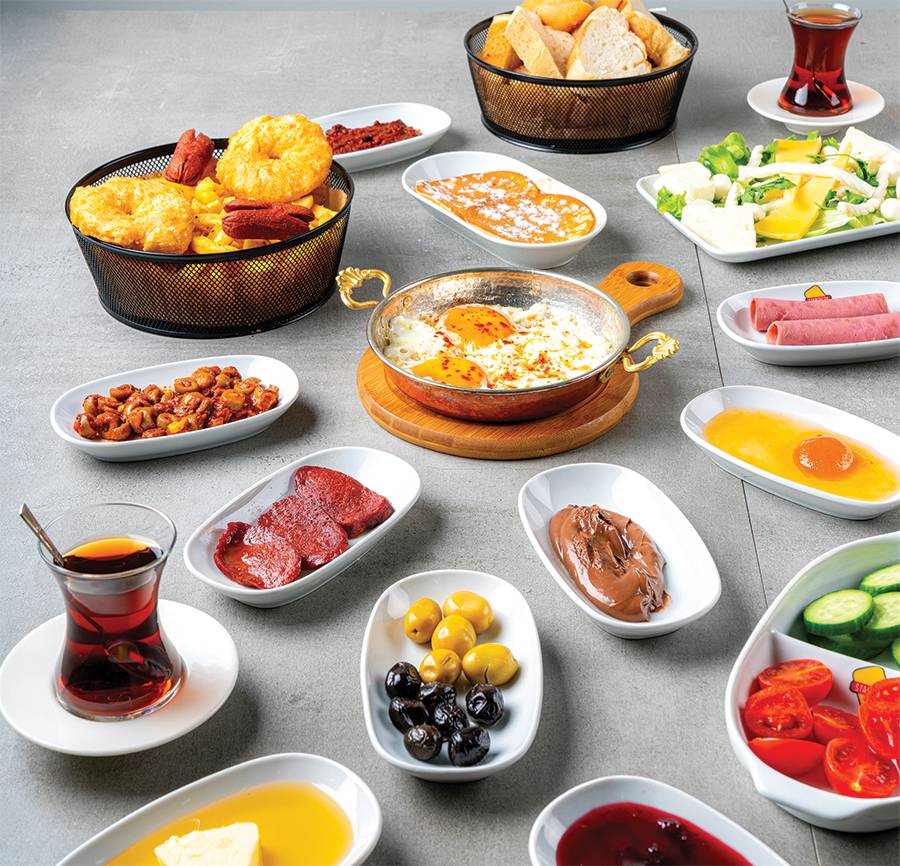 Beyaz peynir, Eski kaşar, Çeçil peynir, Siyah zeytin, Yeşil zeytin, Acuka, Çeri Domates, Salatalık, Köz biber, Tereyağ, Bal, Reçel, Çikolata, Patates, Sigara böreği, Sosis, Pişi, Sahanda sucuk,sahanda yumurta,Sınırsız çay.